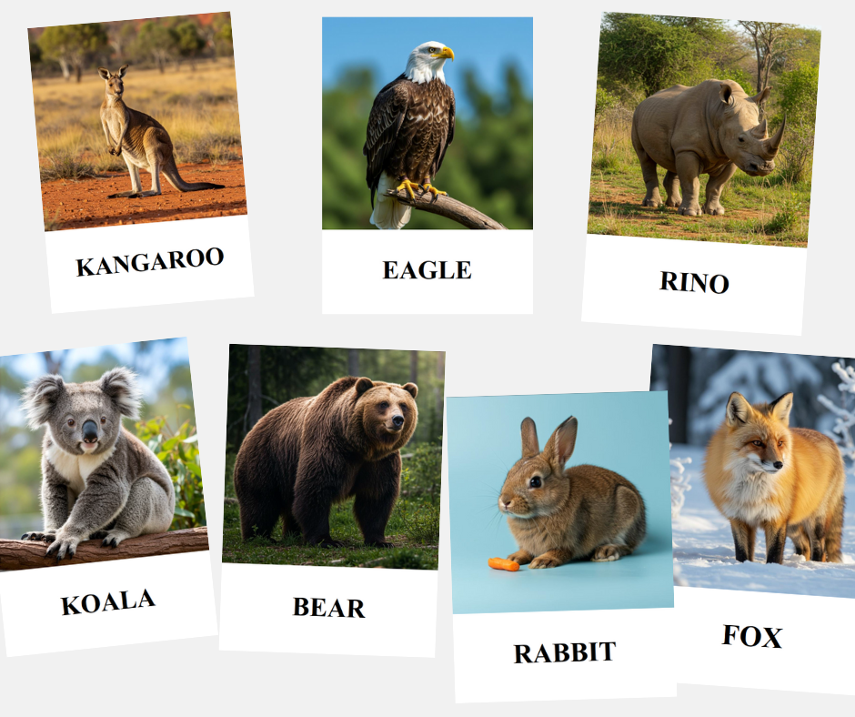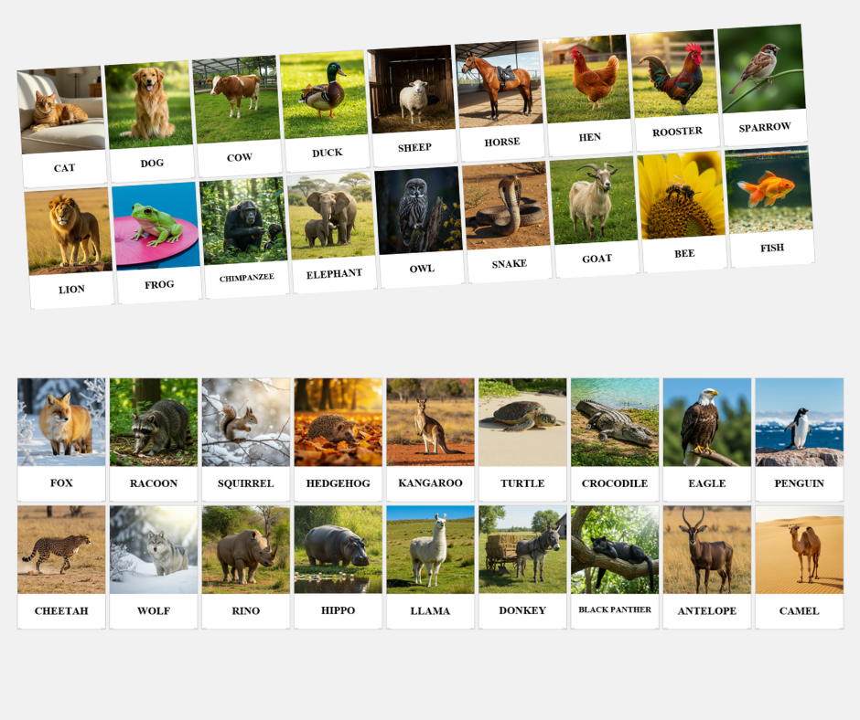 - 50 high-quality, realistic animal flashcards (PDF format – ready to print or use digitally)